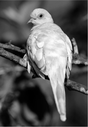 Most diamond doves are all white, but this dove has fawn-colored feathers due to a genetic mutation.